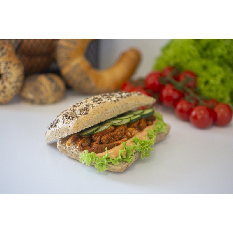 Bułka pszenna z ziarnami, z karkówką, sriracha mayo i świeżym ogórkiem