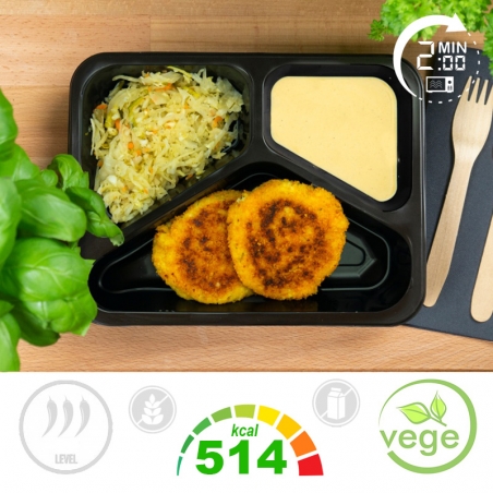 "Składniki: Kotlet ruski 51,4% (puree ziemniaczane (ziemniaki (95%), olej rzepakowy, tłuszcz roślinny, sól, biały pieprz) 53,6%, twaróg półtłusty /z MLEKA/ 11,9%, cebula 11,9%, mąka PSZENNA 11,9%, JAJA 9,9%, olej rzepakowy 0,7%), Kapusta kiszona 25,6% (kapusta kiszona (kapusta, marchew, woda, sól) 100%), Sos cebulowy 23% (cebula 26,2%, śmietanka UHT (śmietanka /z MLEKA/, stabilizator: karagen) 22,5%, bulion warzywny (marchew, SELER, pietruszka, por, sól, pieprz czarny, woda) 18%, masło /z MLEKA/ 14,2%, ser topiony /z MLEKA, zawiera białko JAJA/ 13,5%, ocet winny 5,4%, majeranek 0,1%, tymianek suszony 0,1%, pieprz czarny 0%, sól 0%)"