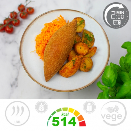 Składniki: ziemniaczki małe z oregano (ziemniaki 98%, olej rzepakowy 1,6%, oregano, pieprz czarny, sól, czosnek) 37,5%, kotlet de volaille (filet z piersi kurczaka, MASŁO (z MLEKA), masa JAJOWA, bułka tarta (MĄKA PSZENNA, drożdże, sól), przyprawy, pieprz czarny, olej, pietruszka) 37,3%, surówka colesław (kapusta biała, marchew, majonez (olej rzepakowy, olej sojowy, ocet spirytusowy, żółtko JAJA, przyprawy (GORCZYCA), sól, regulator kwasowości: kwas cytrynowy, naturalny aromat), chrzan, erytrytol, sok z cytryny, sól, aromat, kwas askorbinowy) 24,9%, natka pietruszki suszona 0,2%