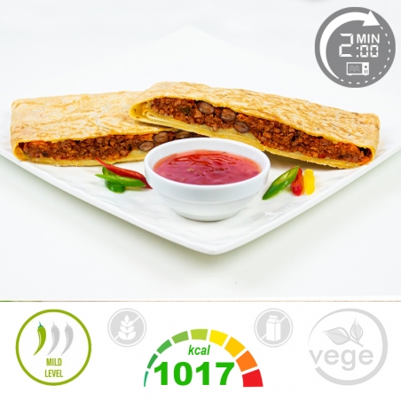 Składniki: Chilli con carne (45,6%) (łopatka wieprzowa, passata pomidorowa (pulpa) (pomidory, sok pomidorowy, kwas cytrynowy), fasola czerwona (konserwowa), kukurydza (konserwowa), koncentrat pomidorowy (30%), cebula biała, zielone papryczki ostre (jalapeno), olej rzepakowy, czosnek, kmin rzymski, pieprz czarny, sól), Naleśnik (44,5%) (MĄKA PSZENNA, MLEKO SPOŻYWCZE (3.2% TŁ), JAJA KURZE, olej rzepakowy, woda, sól, cukier), Salsa (6,6%) (SALSA MEXICANA (koncentrat pomidorowy, cukier, papryka, cebula, ocet, pomidor suszony, sól, kolendra, czosnek, kumin, pieprz, aromaty, pieprz cayenne, olej rzepakowy, przyprawy)), Cheddar (3,3%) (SER CHEDDAR (MLEKO KROWIE PASTERYZOWANE, KULTURY BAKTERII MLEKOWYCH, SÓL, PODPUSZCZKA MIKROBIOLOGICZNA, BARWNIK)).